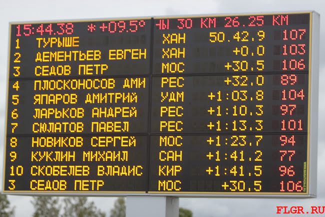 На табло промежуточные результаты за 3,75 км до финиша.