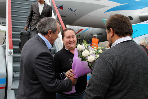 В аэропорту Елену Валерьевну встречали заместитель министра по спорту РХ Виктор Струков и директор Центра спортивной подготовки по лыжным гонкам «Тея» Александр Мальцев.